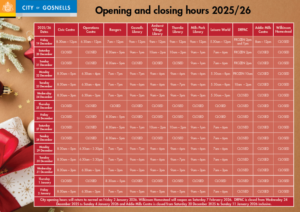 Click here to download the City's opening and closing hours for 2025/26 flyer.